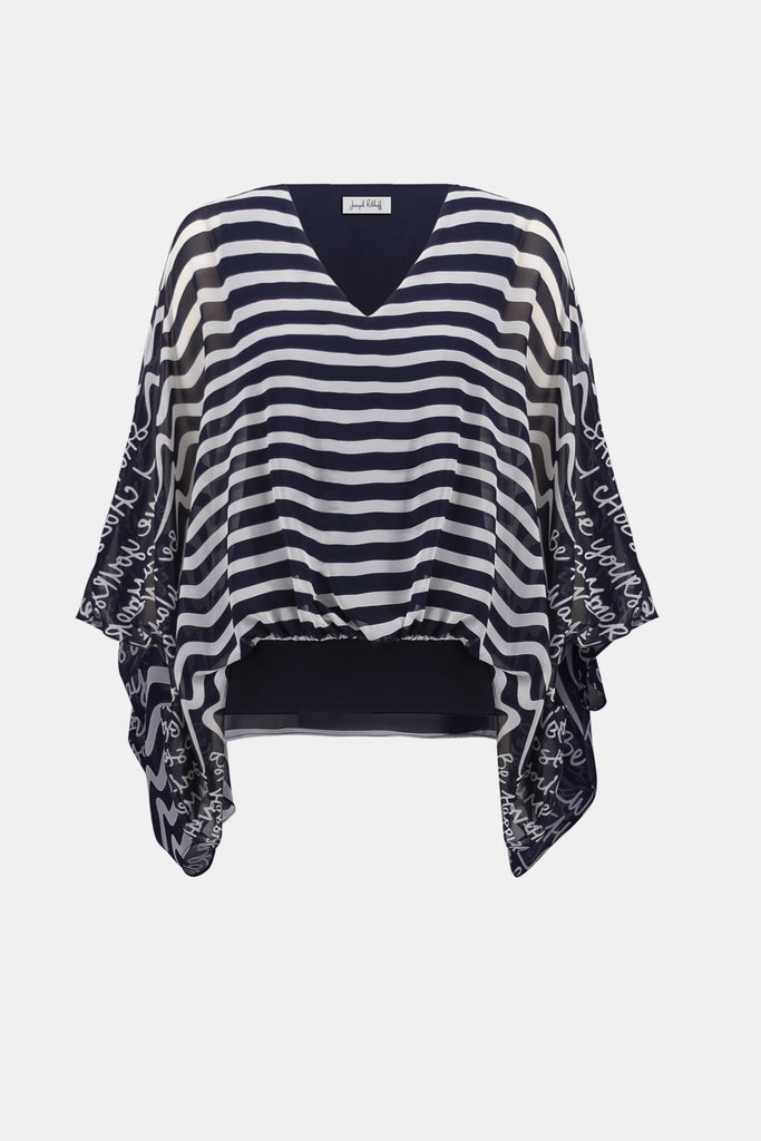 This chiffon poncho top features a lively conversational print, balanced by a silky knit underlayer cami for coverage. A V-neckline highlight the flowing three-quarter sleeves and light, airy silhouette.