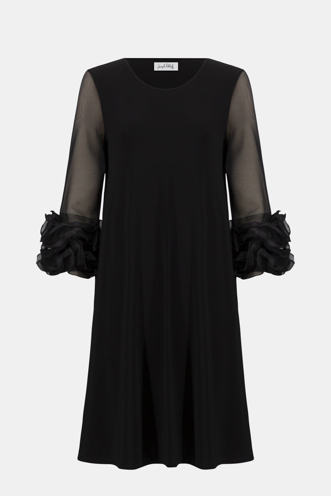 Feminine and flowy, this trapeze dress blends silky knit and mesh for soft structure. Featuring a scoop neckline, three-quarter bell sleeves trimmed with ruffles, and inseam pockets for a functional finish.