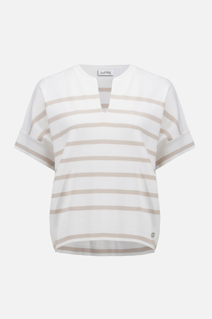 This striped sweater, crafted from viscose and nylon, features a relaxed high-low hem and a notched V-neckline. Its short dolman sleeves and boxy silhouette make it an easy, casual piece for any occasion.